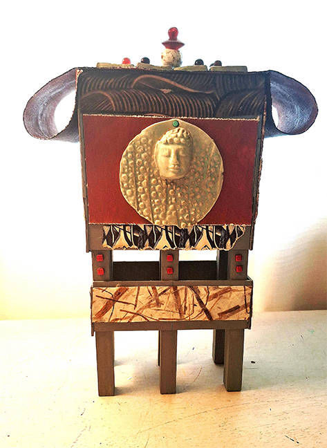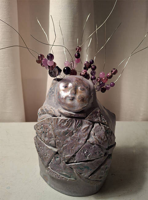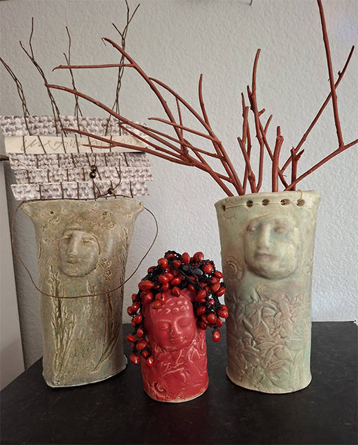ceramics, mixed media of twigs, paper, beads, floral wire